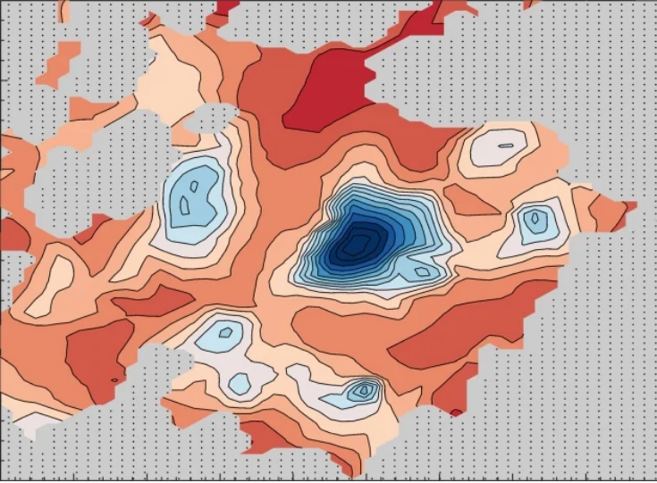 Карта радиолокационных данных. Синие области обладают высокой отражающей способностью, что указывает на запасы жидкой воды
