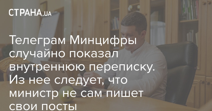В Телеграм-канал министерства цифровой трансформации Украины попало сообщение из внутренней переписки пресс-службы главы ведомства Михаила Федорова, из которого следует, что посты за министра в социальных сетях пишет другой человек.
