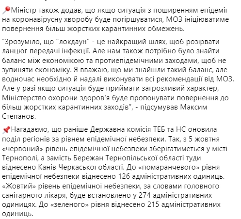 "24 сентября, когда Тернополь перешел в "красную" категорию эпидемической опасности, показатель заболеваемости на 100 тыс. населения за 14 дней составлял 615 больных. Через неделю он снизился до 484. То есть мы сразу видим, что введение этих ограничительных мер помогает снизить уровень заболеваемости", - заявил глава Минздрава.