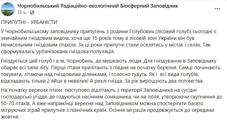 "В Чернобыльском заповеднике вяхирь из семьи Голубей (лесной голубь) сегодня является обычным гнездовым видом, хотя еще 15 лет назад в лесной зоне Украины он был немногочисленной гнездовой птицей. За эти годы вяхири стали селиться в городах и селах. Так сформировалась урбанистическая гнездовая популяция. Гнездится этот голубь и в городе Чернобыль, где живут люди. Для гнездования в Заповеднике выбирает все типы леса", - указано в сообщении.