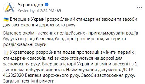 "Укравтодор разработал и подал предложения изменить перечень стандартных средств, используемых на дороге для успокоения движения. Впервые в истории Украины эти изменения внесены и с 1 ноября вступят в силу", - говорится в сообщении.