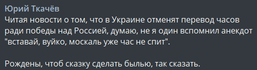 "Читая новости о том, что в Украине отменят перевод часов ради победы над Россией, думаю, не я один вспомнил анекдот "вставай, вуйко, москаль уже час не спит".