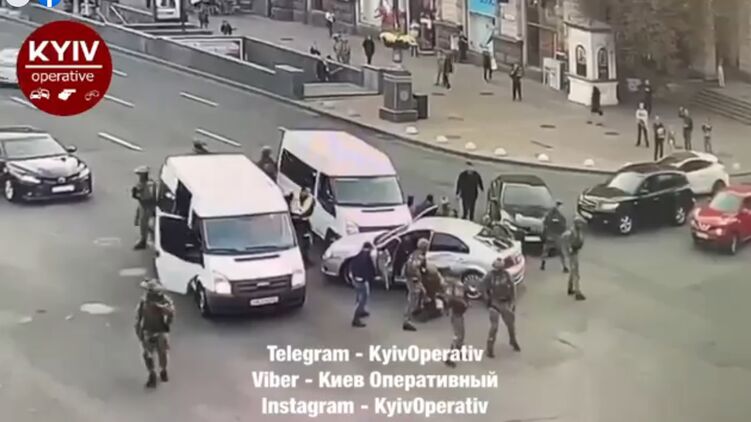 На кадрах видно, как легковушка бандитов мчится по Крещатику и пытается свернуть на улицу Прорезную, однако путь ей преграждает ряд других машин. Пока она старается развернуться, задевая окружающие автомобили, ее блокируют фургон силовиков и пешие спецназовцы.