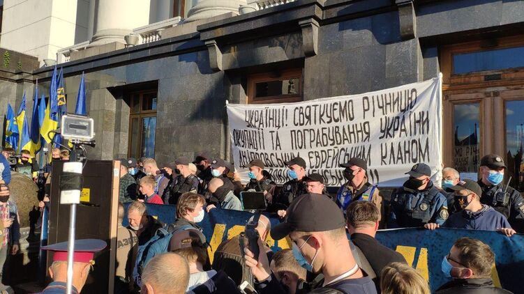 "Ждём реакцию правоохранительных органов. Под офисом президента неизвестные развернули баннер с содержанием "Украинцы! Празднуем годовщину оккупации и грабежа Украины Днепровским еврейском кланом Вовы Зеленского". Объединённая еврейская община Украины заявляет, что это является антисемитизмом: приписывание евреям ответственности за реальные или надуманные проступки отдельных еврейских индивидуумов или групп, или за действия, совершенные неевреями", - указано в сообщении.