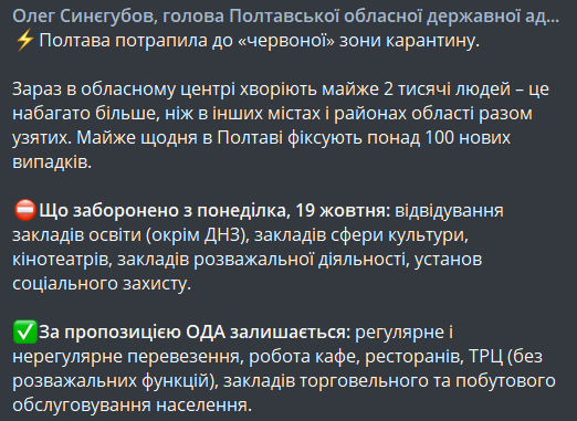 Губернатор области Олег Синегубов заявил, что транспорт будет работать, кафе, рестораны и ТРЦ - тоже. Остаются в строю и заведения быта - парикмахерские, спа, а также все магазины. Закрывается образование, культура, развлекательные учреждения, кино и соцзащита.
