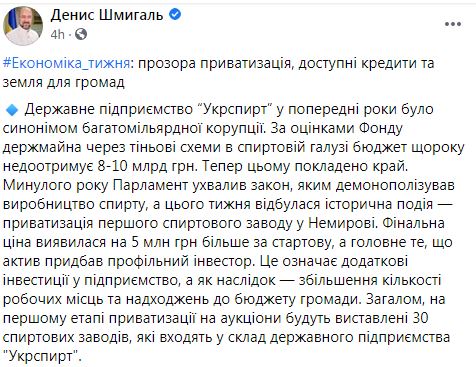 "По оценкам Фонда госимущества через теневые схемы в спиртовой отрасли бюджет ежегодно недополучает 8-10 млрд грн. Теперь этому положен конец. В прошлом году Парламент принял закон, которым демонополизировал производство спирта, а на этой неделе произошло историческое событие - приватизация первого спиртового завода в Немирове. Финальная цена оказалась на 5 млн грн больше стартовой, а главное то, что актив приобрел профильный инвестор", - написал премьер.