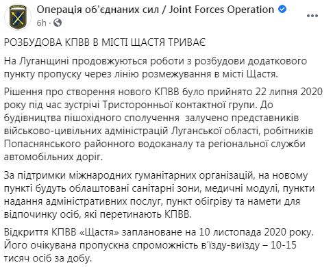 "Решение о создании нового КПВВ было принято 22 июля 2020 г. во время встречи Трехсторонней контактной группы. К строительству пешеходного сообщения привлечены представители военно-гражданских администраций Луганской области, рабочих Попаснянского районного водоканала и региональной службы автомобильных дорог", - сказано в сообщении.