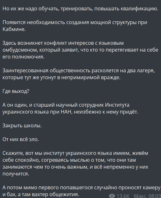 И дело не дойдёт до того, на каком языке человек ведёт внутренний диалог сам с собой лишь потому, что миелофон пока ещё не изобрели. Все остальные сферы будут беспощадно украинизированы".