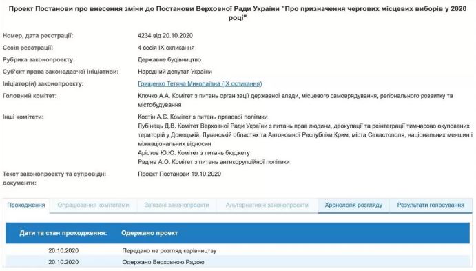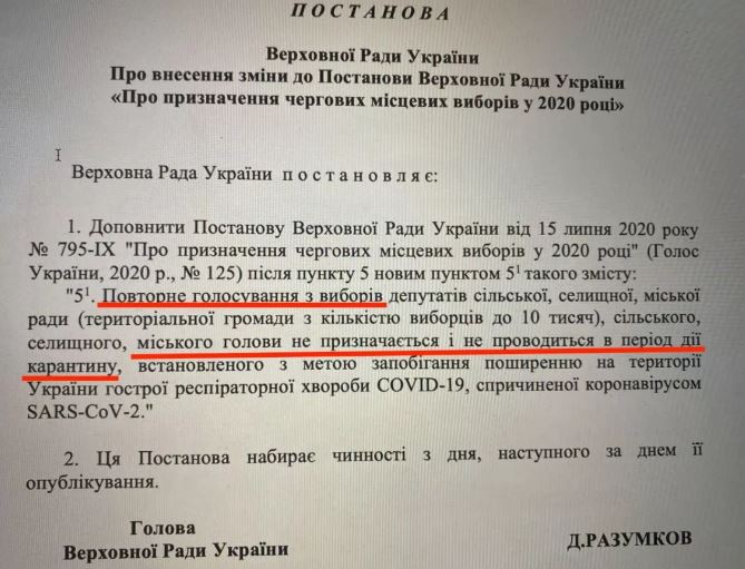 Депутатами от "Слуги народа" в Верховной Раде зарегистрировано постановление, отменяющее повторное голосование на выборах депутатов сельского, поселкового, городского совета (территориальной общины с количеством избирателей в 10 000) и сельского, поселкового, городского головы.