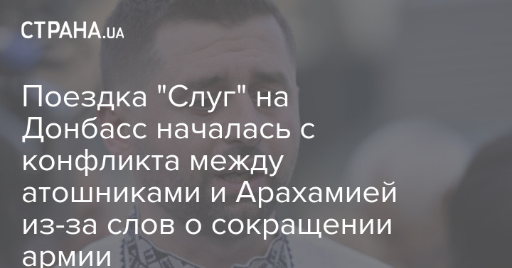 На перроне вокзала в Константиновке, куда утром приехали депутаты от "Слуги народа", недовольные ветераны АТО высказали претензии главе фракции Давиду Арахамии в связи с его заявлением о возможном сокращении армии.