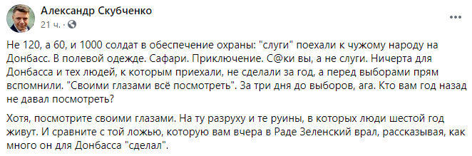 "Не 120, а 60, и 1000 солдат в обеспечение охраны: "слуги" поехали к чужому народу на Донбасс. В полевой одежде. Сафари. Приключение. С@ки вы, а не слуги. Ничерта для Донбасса и тех людей, к которым приехали, не сделали за год, а перед выборами прям вспомнили. "Своими глазами всё посмотреть". За три дня до выборов, ага. Кто вам год назад не давал посмотреть?