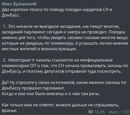 2. Некоторые тг каналы ссылаются на неофициальные комментарии ОП о том, что СН начала проваливать законы по Донбассу, и поэтому депутатов отправили туда посмотреть.