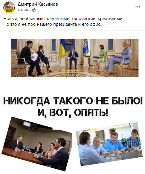 "Новый, необычный, элегантный, творческий, креативный... Но это я не про нашего президента и его офис", - подписал он.