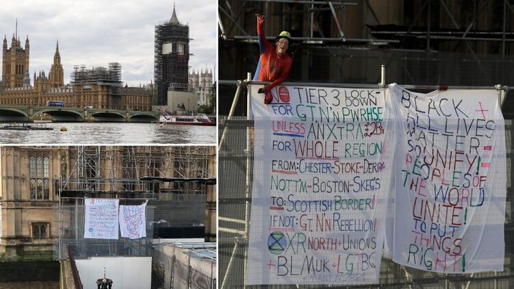 Anti-tier 3 lockdown protester scales Big Ben scaffolding pic.twitter.com/kUKpWAGaEM