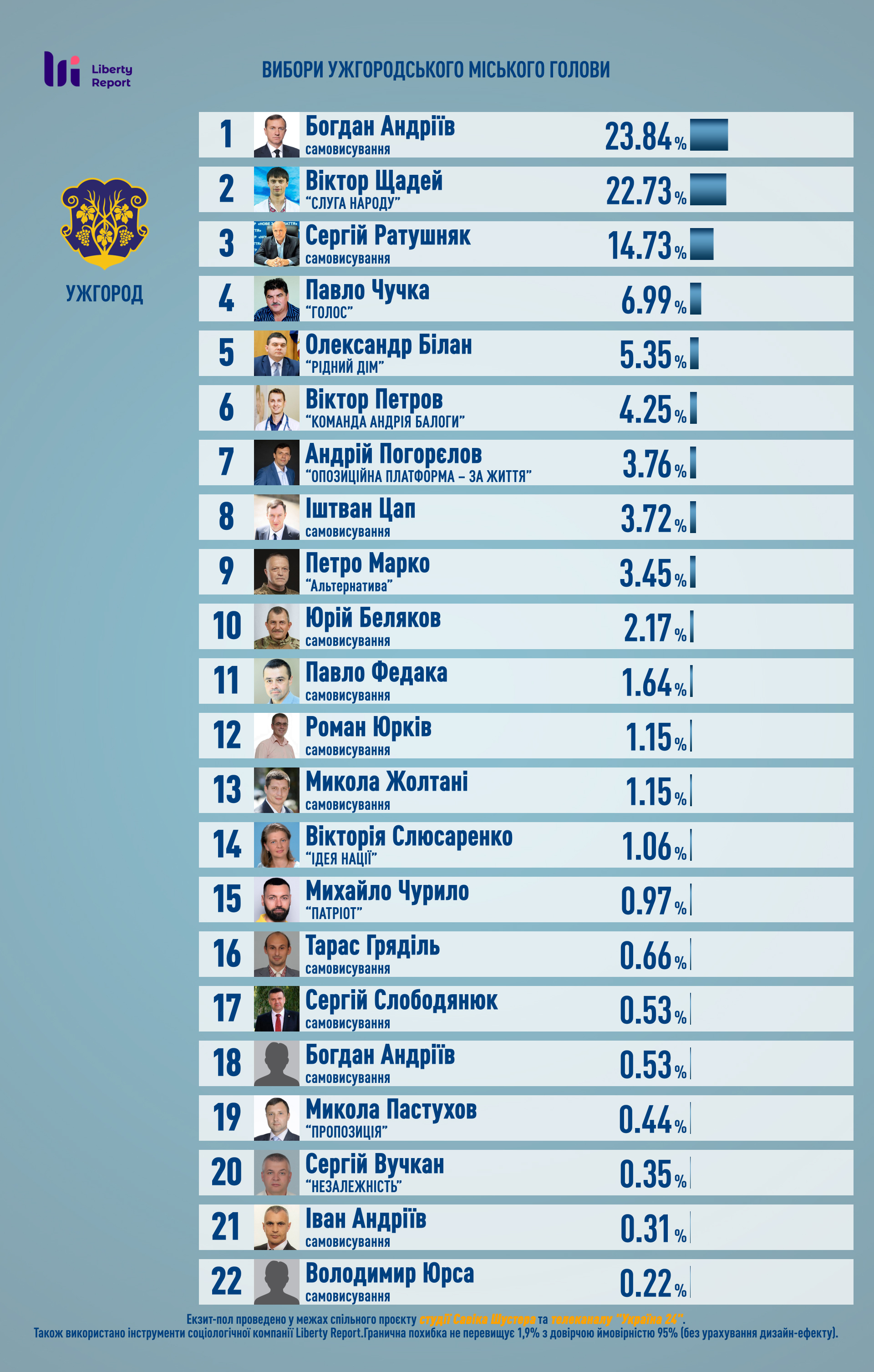22:17 Данные по выборам мэра в Ужгороде (экзитпол студии Савика Шустера и компании Liberty Report).