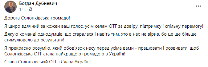 11:05 Экс-нардеп от БПП Богдан Дубневич заявил, что стал главой Солонковской тергромады на Львовщине. СМИ со ссылкой на его штаб пишут, что Дубневич набрал 51,3% голосов.