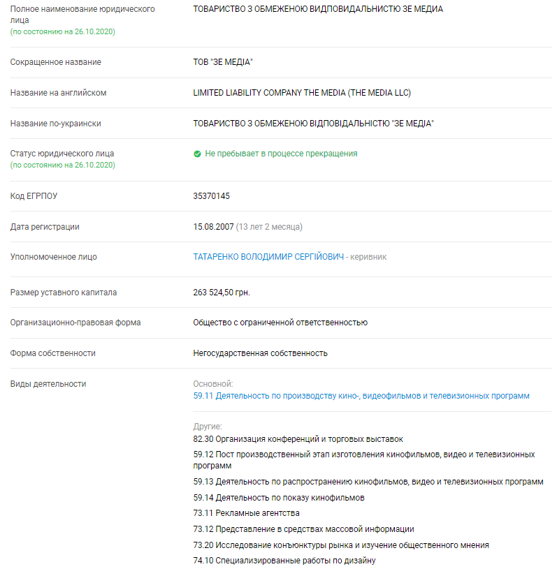 В госреестрах указывается, что эта фирма расположена в Киеве, директором числится Владимир Татаренко. Среди ее сфер деятельности - "Исследование конъюнктуры рынка и изучение общественного мнения". Но основным видом значится "Деятельность по производству кино-, видеофильмов и телевизионных программ".