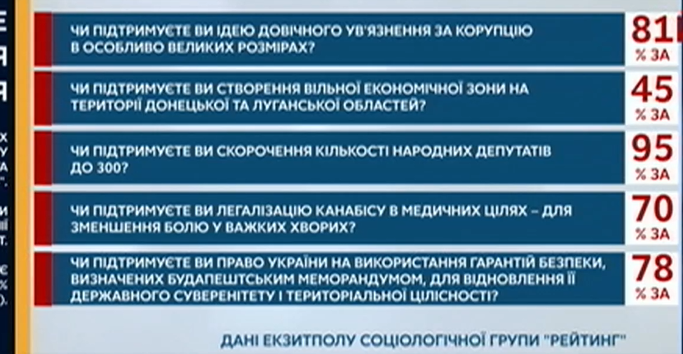 За пожизненное коррупционерам высказались 81%. За сокращение депутатов до 300  - 95% "за". За легализацию медицинского каннабиса - 70%. За обращение к странам Будапештского меморандума - 78%.
