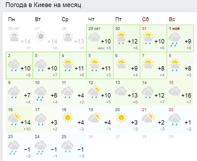 По данным сайта Gismeteo, в Киеве в начале ноября, примерно до 5-го числа, пройдут дожди. Дневная температура +9...+1.