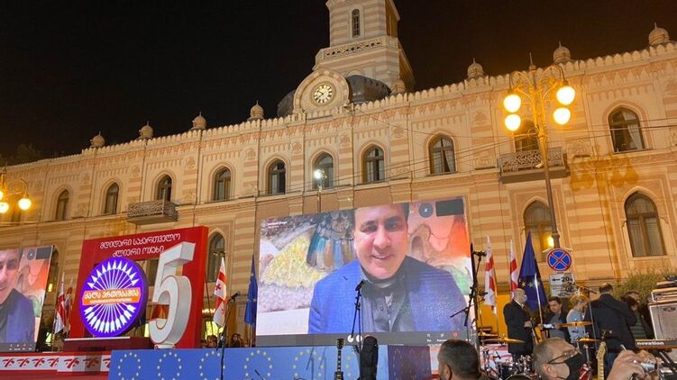 Певец Вахтанг Кикабидзе, который возглавляет список оппозиционного блока, представил собравшимся Саакашвили. Когда тот подключился по удаленной связи, собравшиеся принялись скандировать "Миша! Миша!".