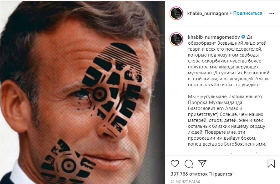 В пятницу, 30 октября, Хабиб Нурмагомедов выступил с критикой президента Франции Эмануэля Макрона, которого Муфтий Чечни назвал террористом № 1 в мире и врагом ислама.