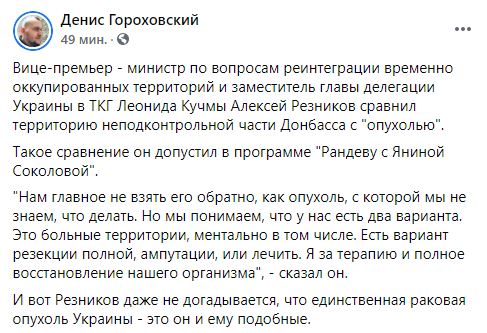"Резников даже не догадывается, что единственная раковая опухоль Украины - это он и ему подобные", - написал Денис Гороховский.