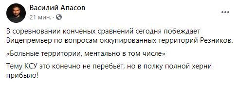 "В соревновании конченых сравнений сегодня побеждает Вице-премьер по вопросам оккупированных территорий Резников. "Больные территории, ментально в том числе".