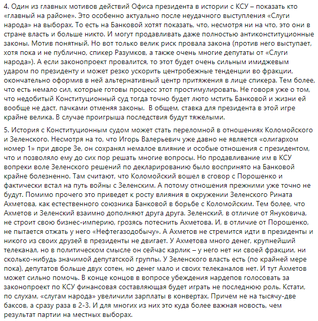 5. История с Конституционным судом может стать переломной в отношениях Коломойского и Зеленского. Несмотря на то что Игорь Валерьевич уже давно не является "олигархом номер 1" при дворе Зе, он сохранял немалое влияние и особые отношения с президентом, что и позволяло ему до сих пор решать многие вопросы. Но продавливание им в КСУ вопреки воле Зеленского решений по декларированию было воспринято на Банковой крайне болезненно. Там считают, что Коломойский вошел в сговор с Порошенко и фактически встал на путь войны с Зеленским. А потому отношения прежними уже точно не будут. Помимо прочего это приведет к росту влияния в окружении Зеленского Рината Ахметова, как естественного союзника Банковой в борьбе с Коломойским. Тем более что Ахметов и Зеленский взаимно дополняют друга друга. Зеленский, в отличие от Януковича, не строит свою бизнес-империю, грозясь потеснить Ахметова. И, в отличие от Порошенко, не пытается отжать у него "Нефтегазодобычу". А Ахметов не стремится идти в президенты и никого из своих друзей в президенты не двигает. У Ахметова много денег, крупнейший телеканал, но в политическом смысле он сейчас карлик – у него нет ни своей фракции, ни сколько-нибудь значимой депутатской группы. У Зеленского власть есть (по крайней мере, пока), депутатов больше двух сотен, но денег мало и своих телеканалов нет. И тут Ахметов может сильно помочь. В конце концов, в вопросе убеждения нардепов голосовать за законопроект по КСУ финансовая составляющая будет играть не последнюю роль. Кстати, по слухам, "слугам народа" увеличили зарплаты в конвертах. Причем не на тысячу-две баксов, а сразу раза в 2-3. И для многих из них это куда более важная новость, чем результат партии на местных выборах.