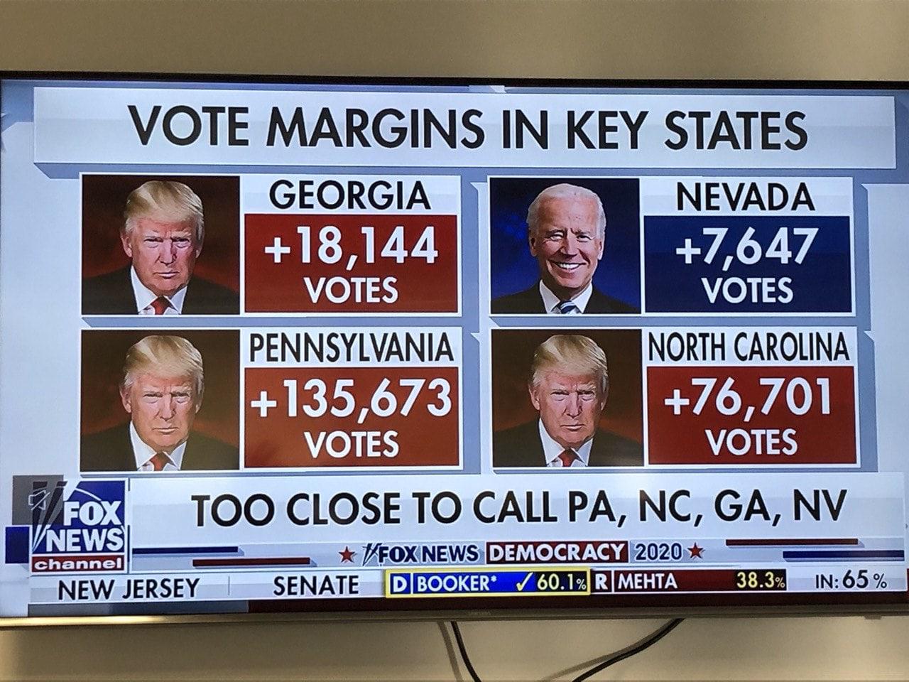 18:43 В Неваде Байден опережает Трампа менее чем на 8 тысяч голосов. В Джорджии Трамп опережает Байдена на 18 144 голоса, в Северной Каролине - на 76 701, в Пенсильвании - на 135 673.
