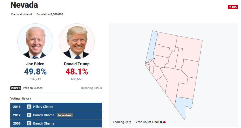 В Неваде (6 выборщиков), которая считается исконно за демократами, продолжает лидировать Байден - 49,3% против 48,7% у Трампа. Обработано 75% голосов.