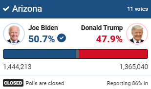По данным Fox News, после подсчета 90% голосов демократ Джо Байден обошел Трампа в Аризоне на 0,5% (18 713) голосов.
