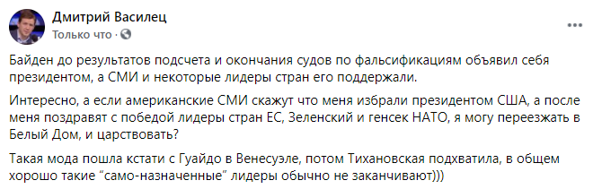 Такая мода пошла кстати с Гуайдо в Венесуэле, потом Тихановская подхватила, в общем хорошо такие "само-назначенные" лидеры обычно не заканчивают", - пишет журналист Дмитрий Василец.