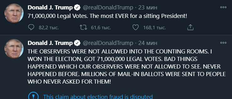 "Наблюдателей не допустили в комнаты для подсчета голосов. Я выиграл выборы, набрал 71 миллион законных голосов. Случилось много плохих вещей, которые нашим наблюдателям не позволили увидеть. Такого раньше не было. Никола не было. Миллионы почтовых бюллетеней разослали людям, которые о них никогда не просили!"
