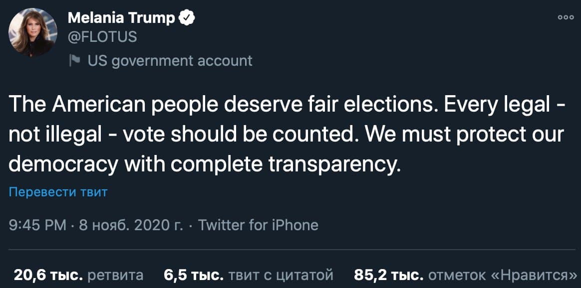"Американцы заслуживают честных выборов. Каждый законный (не незаконный) голос должен быть учтен. Мы должны защитить нашу демократию с помощью полной транспарентности", - написала Меланья в твиттер.