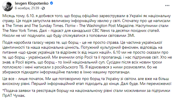 Позже экспертный совет по вопросам нематериального культурного наследия при Министерстве культуры и информационной политики Украины предложил внести борщ в реестр нематериального национального достояния в начале октября. Помимо этого, туда хотят внести клембовскую сорочку с цветком, пасхальное гуляние "Водить Володара" в селе Роскошевка Тепликского района Винницкой области, борщевскую народную вышивку и карпатское лижникарство - технику изготовления покрывал из овечьей шерсти.