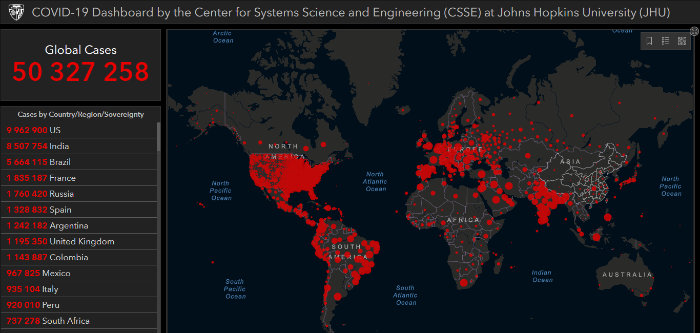 Пандемия коронавируса на Земле преодолела очередной знаковый рубеж. По данным университета Дж. Хопкинса на 06.40 9 ноября (время киевское - Ред.), число зараженных на планете составило уже 50 327 258 человек, умерло 1 255 490 пациентов.