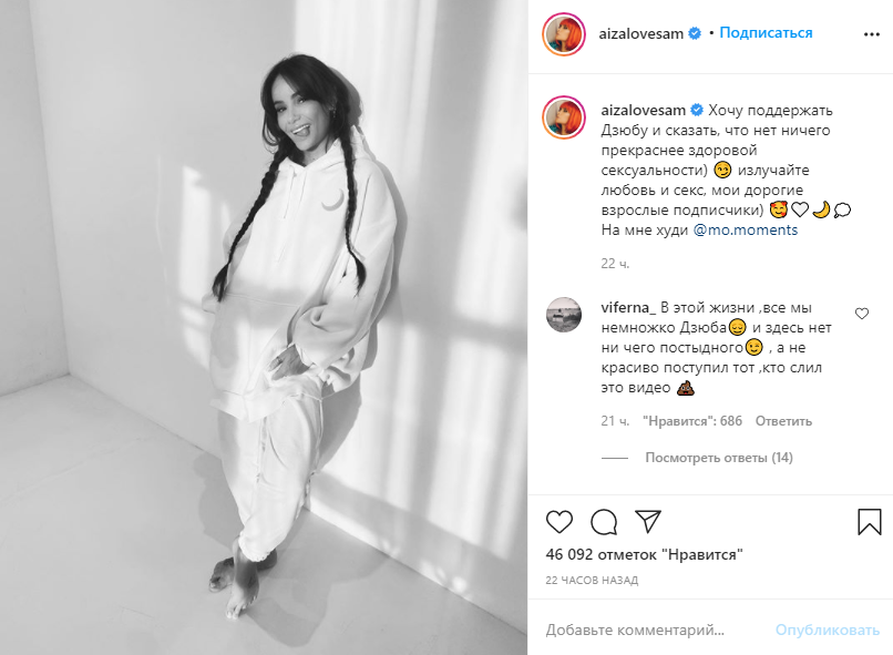 Певица Айза Долматова, чье приватное фото тоже недавно случайно попало в сеть, написала в своем Инстаграме, что "нет ничего прекраснее здоровой сексуальности".