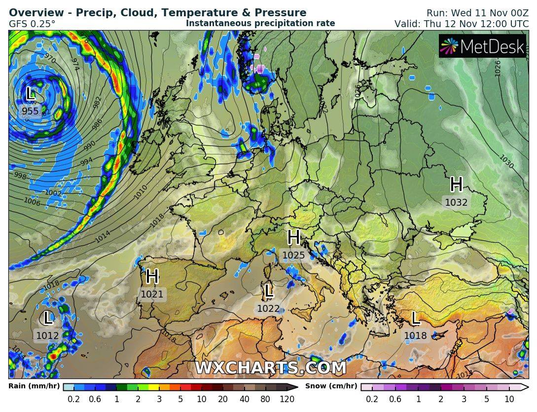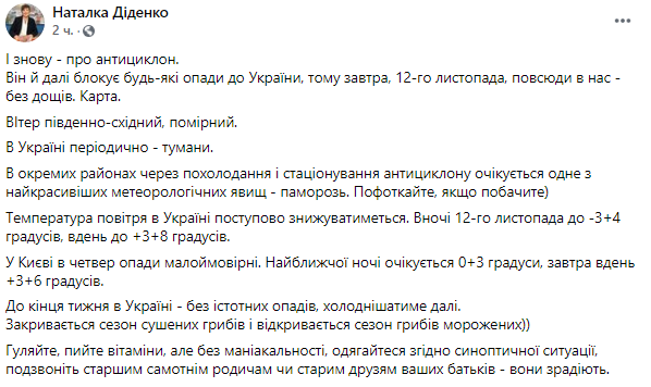 "Антициклон и дальше блокирует любые осадки до Украины, поэтому завтра, 12-го ноября, без дождей", - прогнозирует синоптик.