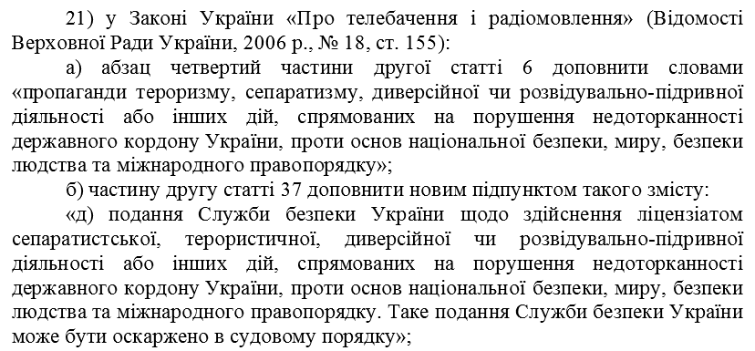 Этот законопроект наделяет СБУ интересной функцией – мониторить пропаганду терроризма и сепаратизма на ТВ и радио. И делать представление на такой телеканал в Нацсовет – после чего тот сможет начать проверку СМИ и дальше либо штрафовать, либо обращаться в суд для отзыва лицензии.