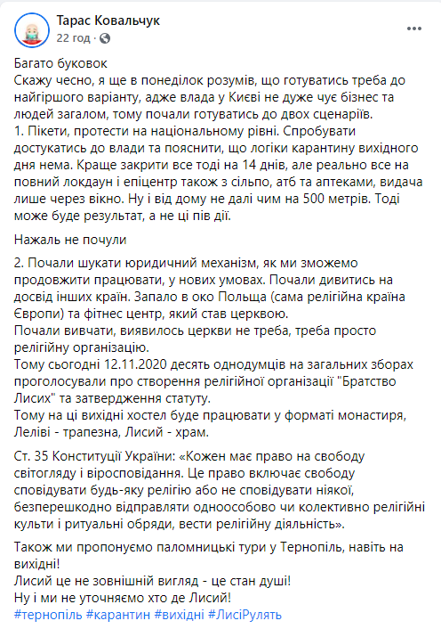 А пока каждый готовится к выходным по-своему. В Тернополе предприниматель Тарас Ковальчук решил основать религиозную организацию "Братство лысых", чтобы хостел и рестораны, которыми он управляет, могли работать во время карантина выходного дня в качестве "монастыря", "храма" и "трапезной".