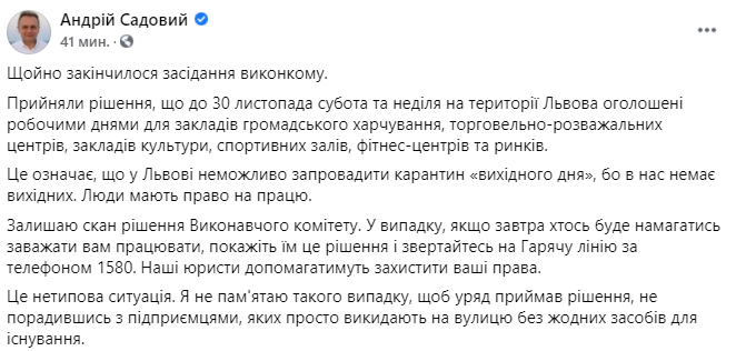 Сегодня горсовет принял решение, что все выходные до 30 ноября для всей сферы услуг и торговли - официально рабочие дни. То есть, по сути, для них отменили само понятие выходных. Чтобы можно было чисто формально не исполнять распоряжение Кабмина.
