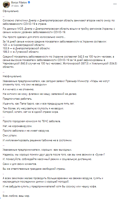 Отказались от карантина и в Днепре. Местный мэр Борис Филатов, который через воскресенье снова попытается выиграть выборы, заявил, что комиссия по ТЭБ и ЧС "заболела", поэтому решение принять не смогла. Затем он порекомендовал горожанам побольше гулять на выходных и обязательно "купить кофе и сосиску у предпринимателей".