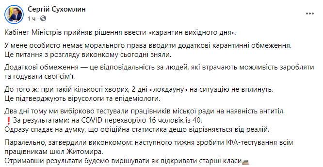 Но не только в городах, где выборы, идет бунт. О том, что "оснований вводить карантин нет", сегодня написал у себя в Фейсбуке и мэр Житомира Сергей Сухомлин. Он заявил, что два дня локдауна на ситуацию не повлияют. И намекнул, что Киев манипулирует статистикой.
