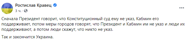 13:05 Юрист Ростислав Кравец пишет, что после незаконного предложения Зеленского разогнать конституционный суд, ему не стоит удивляться, что мэры открыто не исполняют решений центральной власти.