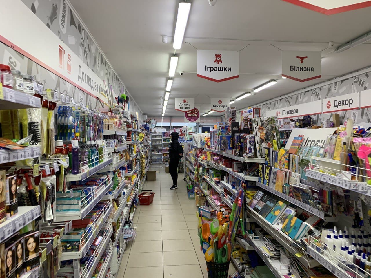 09:54 Магазин "Червоный маркет" возле метро Позняки, работает в обычном режиме. Он специализируется на хозтоварах, но наличие на кассе шоколадных батончиков, чипсов и жевательных резинок позволило магазину обойти карантин выходного дня.