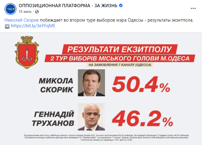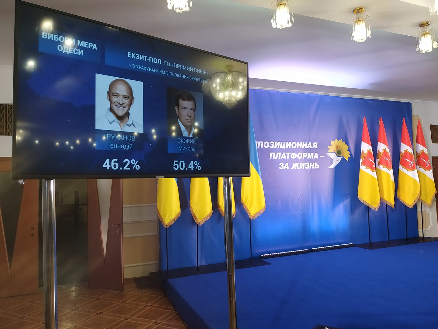 20:25 В штабе ОПЗЖ показали результаты экзитпола ГО "Прямой выбор", по которому выигрывает Николай Скорик.