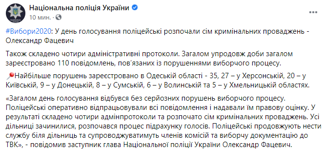 18:05 В полицию поступило уже 54 сообщения, связанных с избирательным законодательством. В частности, 18 - в Сумской, 13 - в Одесской, 12 - в Киевской, по 4 - в Донецкой и Сумской, 3 - в Волынской областях. Копы уточняют, что больше всего зафиксировано фактов незаконной агитации.