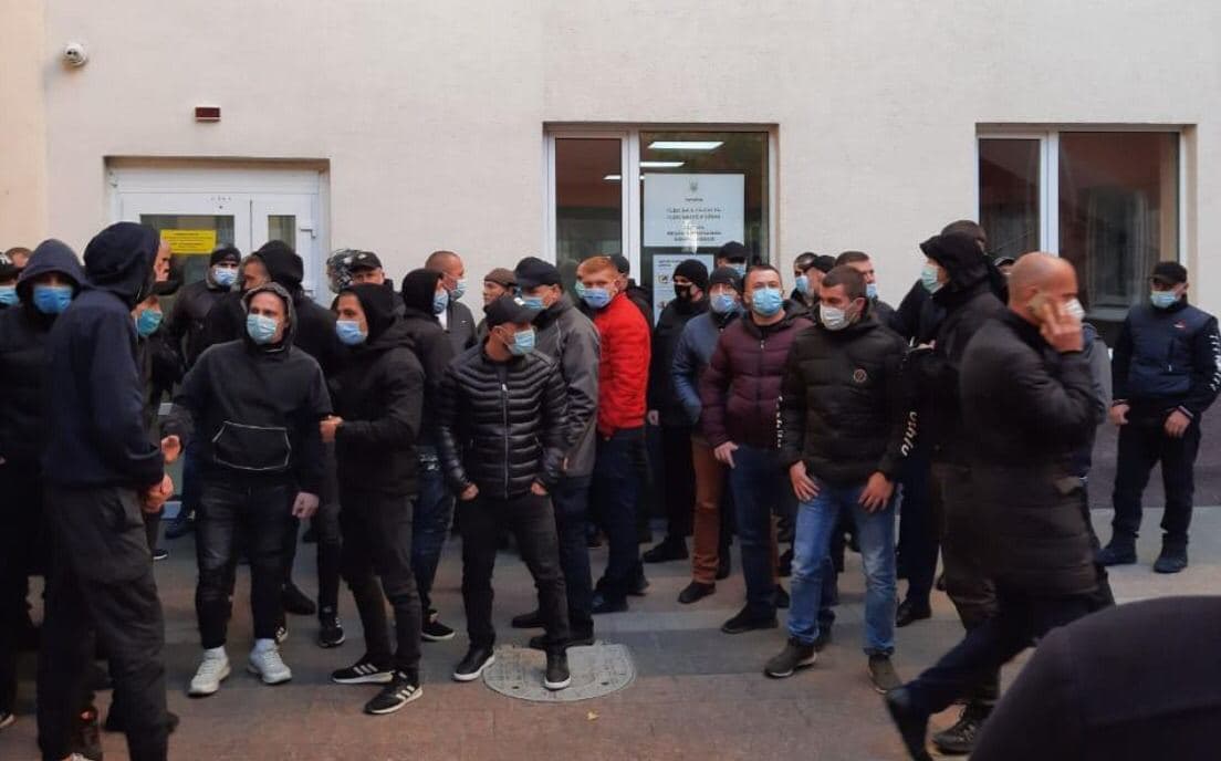 4. Около здания ТИК собираются "титушки" (на фото). В ОПЗЖ заявляют, что их прислал Труханов. Также в ОПЗЖ говорят о том, что мэр, Банковая и национал-радикалы действуют совместно и хотят заблокировать работу нового руководства ТИК с целью фальсификации выборов.