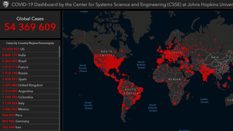 По состоянию на утро 16 ноября, в мире число зараженных перевалило за 54 миллиона, фото: arcgis.com