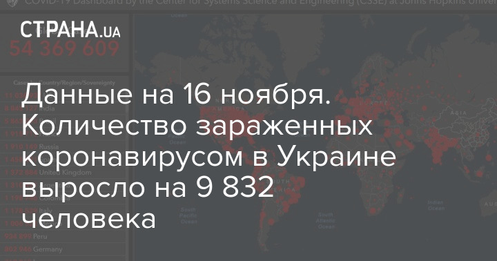 По состоянию на утро понедельника, 16 ноября, в Украине подтвердились 9 832 новых случая заражения коронавирусом. Напомним, что предыдущий антирекорд был отмечен в субботу, 14 ноября, когда за сутки в стране было выявлено 12 524 зараженных.